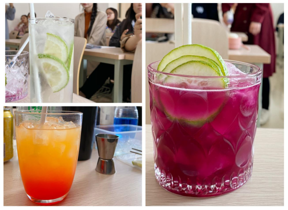 现场调制的几款鸡尾酒都是经典类,其中值得一提的紫色这款是张经理自创的青海特色黑枸杞鸡尾酒,将黑枸杞的颜色和营养价值融入酒中,相辅相成,不仅色泽美观,味道更是醇厚清爽,还有强身健体的功效,得到了大家一致好评。每一款鸡尾酒都有自己独特的味道,有的口感辛辣,有的醇厚悠长,有的清爽甘甜.......引来很多同学的围观和品尝。