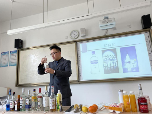 张炜向同学们分享他从咖啡师到调酒师,再到大堂吧经理的心路历程和参加各种比赛的趣事,他自创的黑枸杞鸡尾酒曾获新华联集团的全国大赛一等奖。