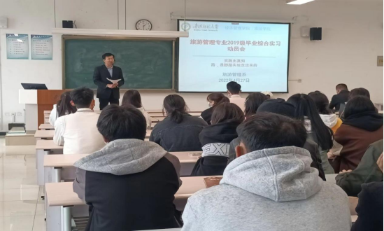 根据旅游管理系2019级旅游管理专业人才培养方案和教学计划,2019级旅游管理专业全体员工将进行旅游行业综合实习。为增强同学们对专业实习重要性的认识,确保实习工作顺利开展,旅游管理专系于2022年4月27日下午,在东四202召开了旅游管理专业2019级毕业综合实习动员会,动员会由系主任范钟庆老师主持,唐仲霞老师、罗赟敏老师、王新然老师、季海瑞老师以及2019级旅游管理专业全体员工参加了大会。