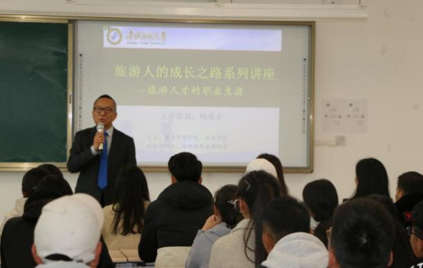 10月9日,青海省康辉国际旅行社总经理兼青海省西宁市旅游协会会长杨成才先生来公司作《旅游人的成长之路——旅游人才的职业生涯》专题讲座。讲座由旅游院管理系主任范钟庆老师主持,旅游管理、酒店管理专业全体员工、西部畅想旅游协会成员及公司老师聆听了讲座。